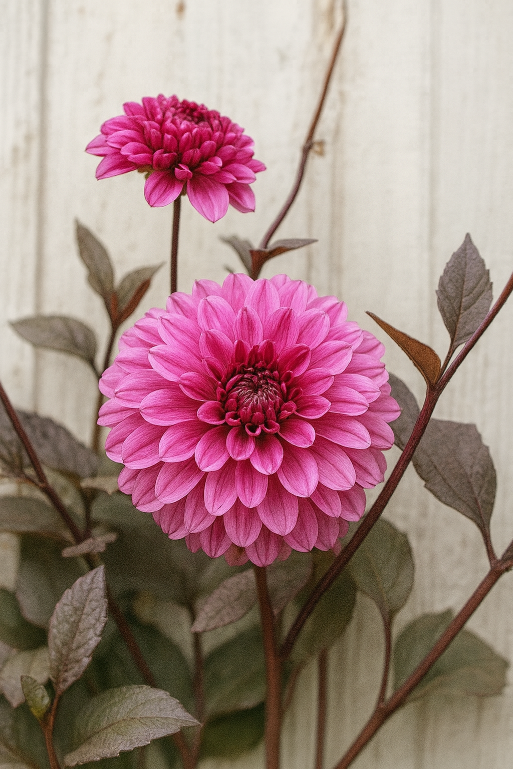 Decorative dahlia known for its rich, deep pink/magenta blooms with a tight center. It stands out with its dark green to purple tipped foliage that make the flowers appear to glow.