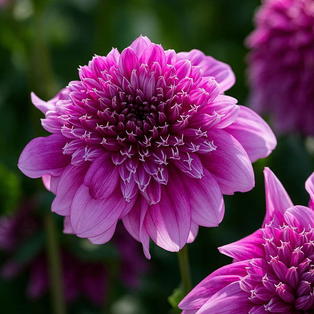 An anemone dahlia that has vibrant, fluffy blooms which transition from a rich burgundy center to intense lilac petals, often with subtle white tips.
